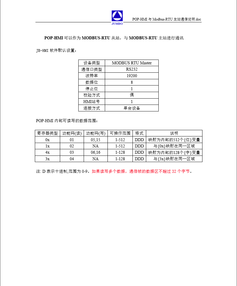 POP-HMI可以作為MODBUS-RTU從站,與MODBUS-RTU主站進(jìn)行通訊